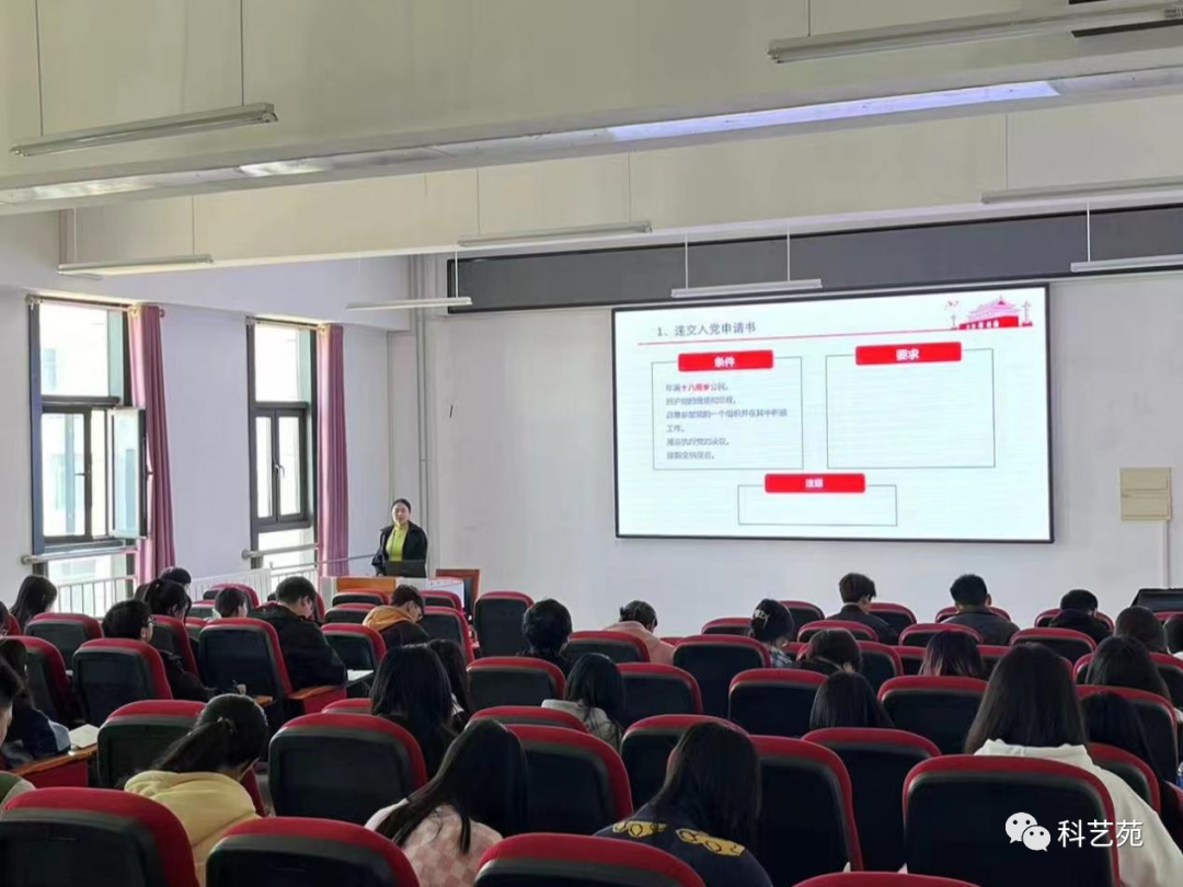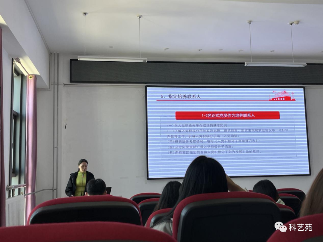在培训课上,张茜老师讲授了有关于发展党员工作实施细则的主要内容。讲述了十个小点,包括党组织派人谈话、会在一个月内有谈话、推荐和确定入党积极分子、上层党委备案、指定培养联系人、培养教育考察,确定发展对象、报上级党委备案、进行政治审查、开展集中培训等流程。