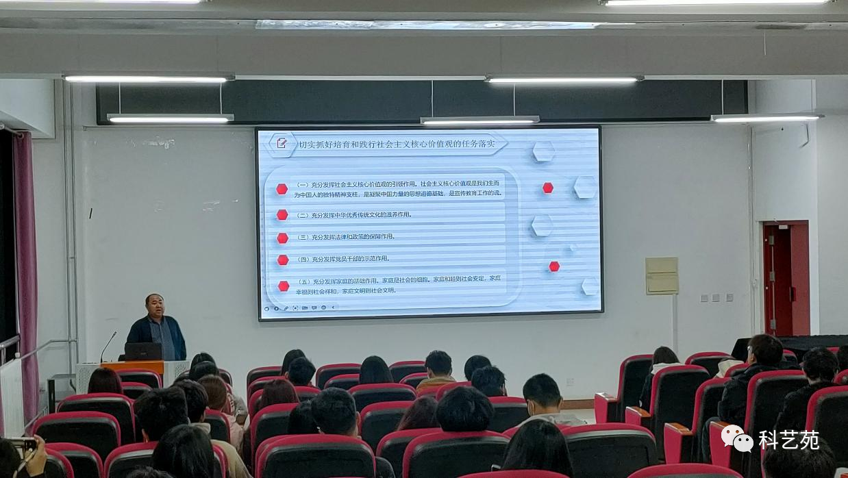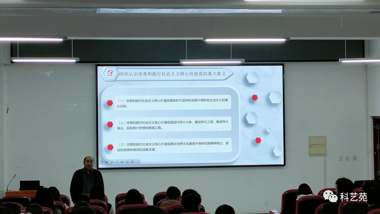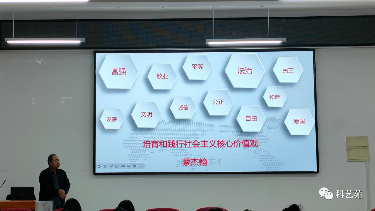 蔡杰翰老师围绕“为什么要培育和践行社会主义核心价值观”展开讲述,社会主义核心价值观凝结着全体人民的共同价值追求,是当代中国精神的集中体现。尤其对当代青年来说,更要培育和践行社会主义核心价值观,胸怀梦想,实干担当。