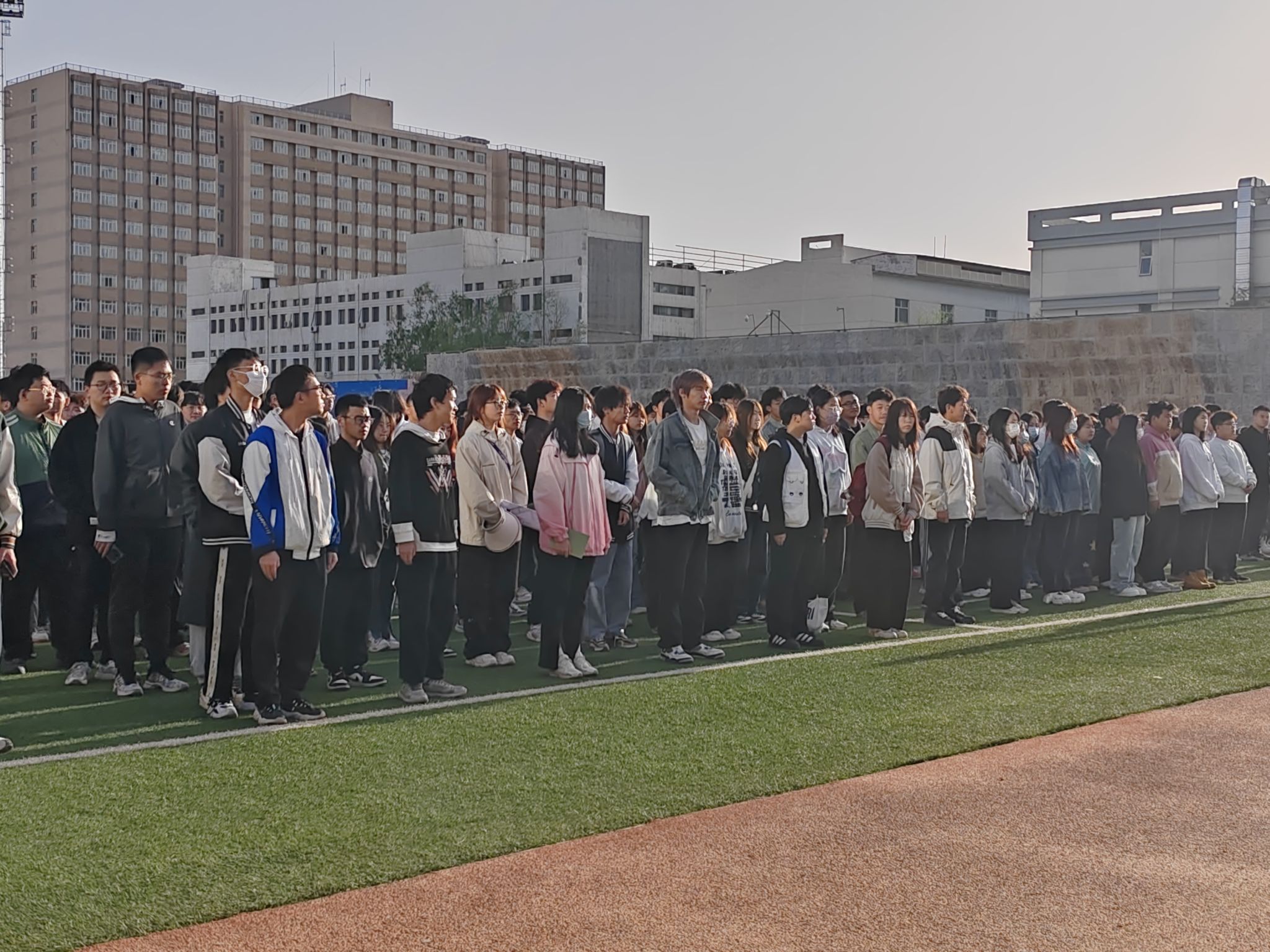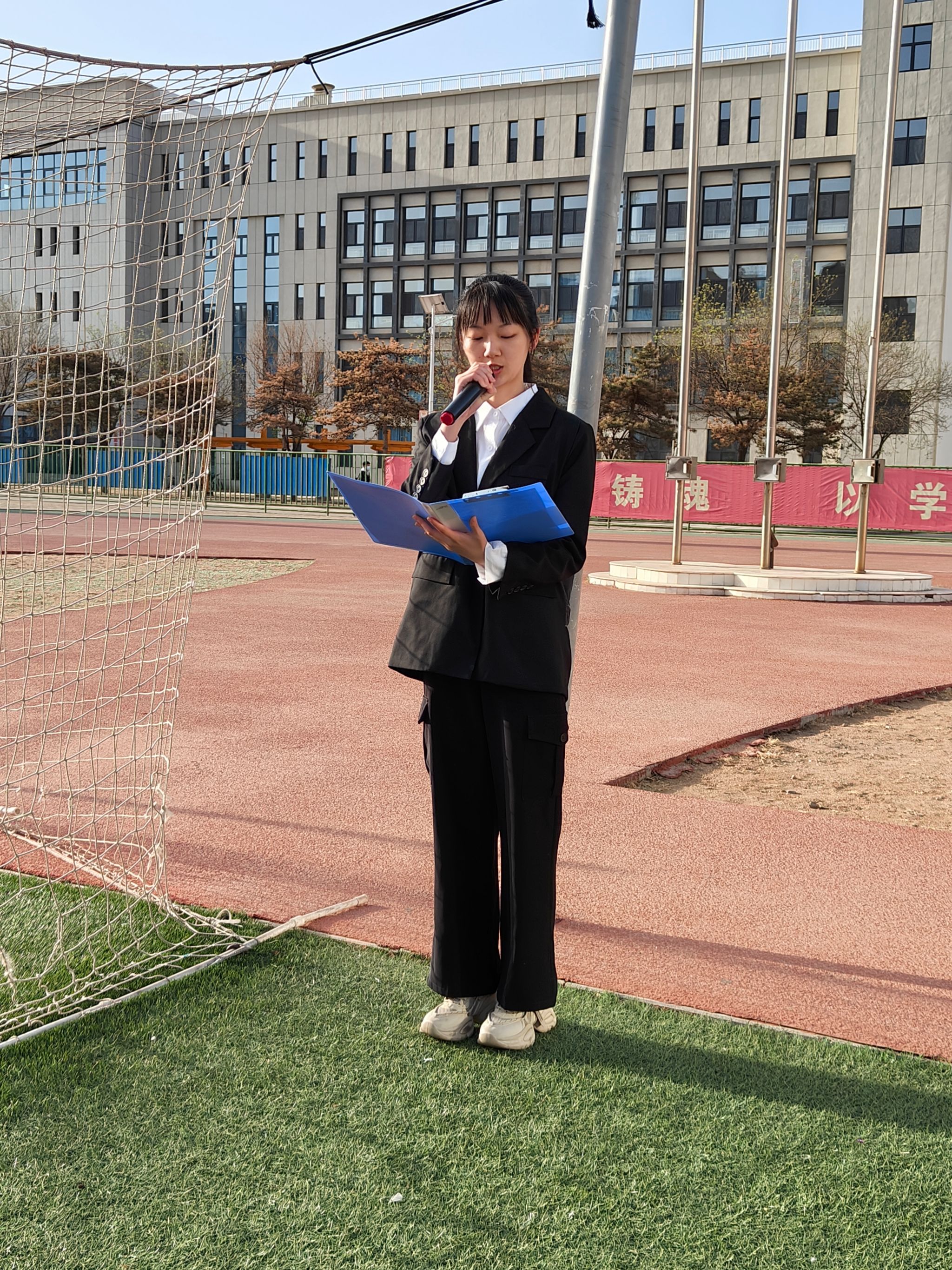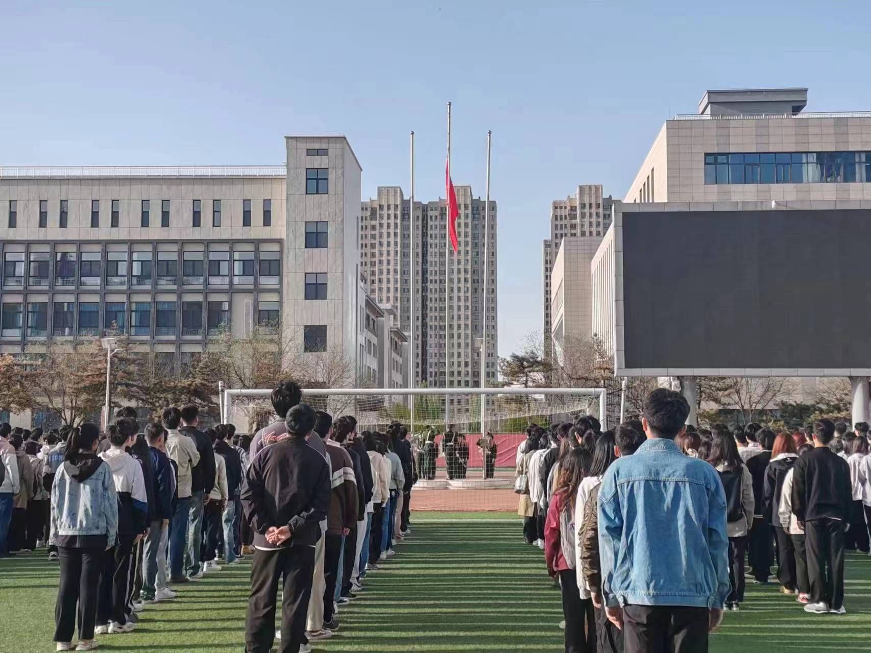 活动第二项,校国旗护卫队队员们迈着整齐而有力的步伐护卫着国旗入场。雄壮的国歌响起,全院师生庄严肃立,面向国旗行注目礼。