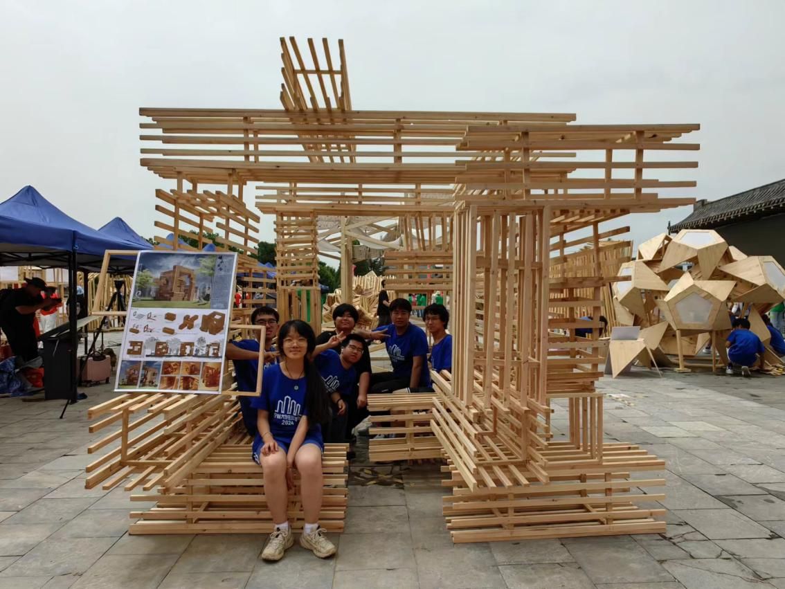 2024年6月21-23日,朱古力av 建筑学专业23级学生陈雨萱、李明阳、马文骏、段鑫昱、周阳、陈阳在魏融老师和周碧瑶老师的指导下,经过3个多月的赛前准备和两天的现场搭建,设计的作品《椽承古今》获得了2024年辽宁省第五届大学生搭建设计竞赛三等奖。