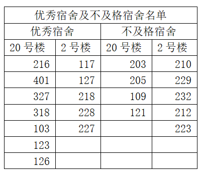 检查结果显示,多数宿舍能严格遵守住宿规定,做到安全规范用电、内务整洁有序,展现出良好的生活习惯与集体风貌,但仍有少数宿舍存在物品杂乱、卫生死角清理不彻底等问题。为树立典型、督促改进,现将本次检查优秀宿舍与通报宿舍名单公示如下: