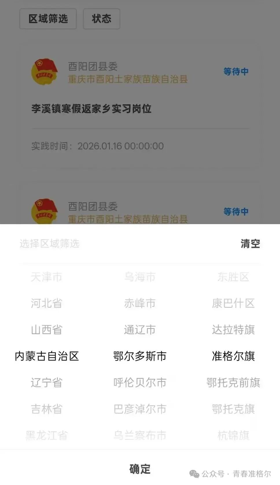 符合相关条件的大学生请根据《2026年准格尔旗寒假大学生“返家乡”社会实践活动岗位表》,就近选择意向服务单位。如有疑问可咨询团旗委学少部。