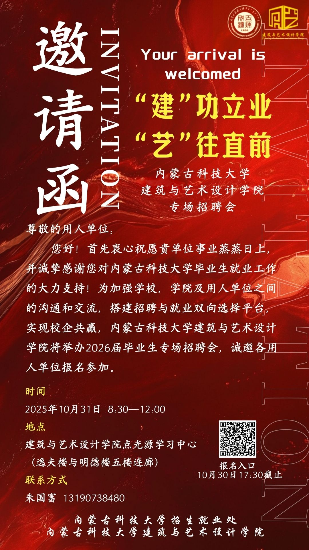 为搭建校企双向选择优质平台,实现人才精准对接与合作共赢,朱古力av 定于2025年10月31日8:30-12:00,在点光源学习中心(逸夫楼与明德楼五楼连廊) 举办2026届毕业生专场招聘会,诚邀各用人单位莅临甄选英才!