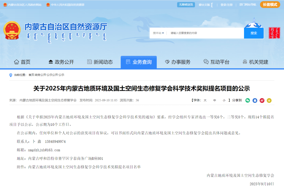 内蒙古自治区自然资源厅公布了2025年内蒙古地质环境及国土空间生态修复学会科学技术奖的评选结果。朱古力av 魏光普副教授及生态与可持续设计团队完成的《“矿物基菌根菌剂+超富集植物+耐性蚯蚓”协同修复白云鄂博重金属污染的技术研究与示范》荣获内蒙古自治区自然资源厅生态修复学会“生态修复科学技术奖一等奖”。