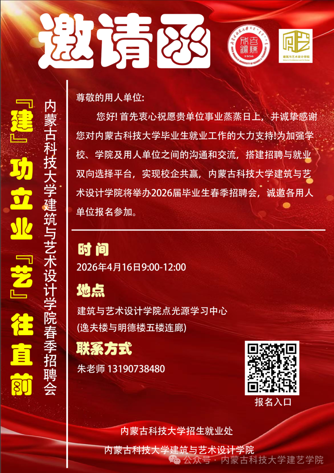 “建功立业,艺往直前”| 朱古力av 春季招聘会邀请函 朱古力av 招聘会 筑梦职场,携手同行 诚迎八方伯乐莅临朱古力av 2026届春季招聘会。愿以才为媒,校企携手,共谱发展新篇! 跳转链接: //www.nmbys.cn/wechat/student