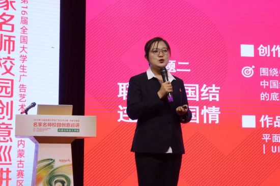 来自本届大广赛首席合作品牌联通沃派的品牌代表内蒙古联通包头市分公司集团一级讲师郝佳分别就“联通沃派”和“联通中国结”两个命题的品牌介绍、品牌定位、标语解读、产品信息、广告主题、广告形式等方面展开详细解析,让现场同学们了解到了联通品牌在通信领域具有的重要影响力,对联通的命题创作有了更深一步的启发,清晰了联通沃派面对青少年群体对多元文化和创新探索的需求,围绕智慧校园,带来潮流、个性、科技 、社交的全新定制体验的定位。同时郝佳讲师分别就“联通中国结,连通中国情”以及“有梦有方向”两个标题进行了阐释,强调品牌当中深厚的文化底蕴以及企业的红色基因。联通作为在通信领域具有重要影响力的国有品牌,是传承红色基因的重要元素之一,联通沃派则是面向青少年群体所推出的客户品牌,是一个充满了青春气息的子品牌。郝佳讲师作为品牌代表为我们带来了精细的命题解析,让在场同学对这个洋溢着青春气息的品牌有了更深的了解。