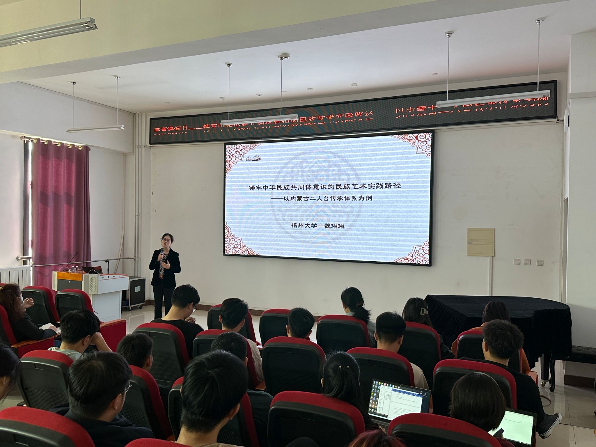 创新性地开展了“美育浸润月”系列演出及学术活动。2024年5月9日,我校邀请到扬州大学特聘教授、优秀青年民族音乐学学者魏琳琳博士,为全校师生带来了一场题为“铸牢中华民族共同体意识的民族艺术实践路径---以内蒙古二人台传承体系为例”的学术讲座。