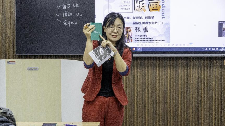美术学系张曦老师为留学生带来《木刻版画艺术》专题讲座。通过介绍版画的历史、分类、代表人物及代表作,使留学生对版画艺术有了初步的了解。随后,结合短视频等形式,着重讲解了木刻版画的发展历史、工艺流程、制作方法、注意事项等,使留学生们对木刻版画有了更深入的认识。