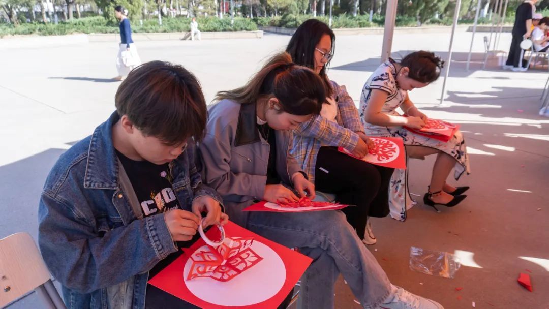 “半扇青山”漆扇制作区,素面竹扇、环保漆料一应俱全,参与者在指导下勾勒“春日山水”,青竹摇曳间,漆色与金箔交相辉映,传统漆艺与春日意境完美融合。“剪韵四时”剪纸区则展现了古今碰撞,既有“春燕衔柳”等传统纹样,也有学生将校园建筑融入剪纸的创意之作,非遗技艺在创新中焕发新生。