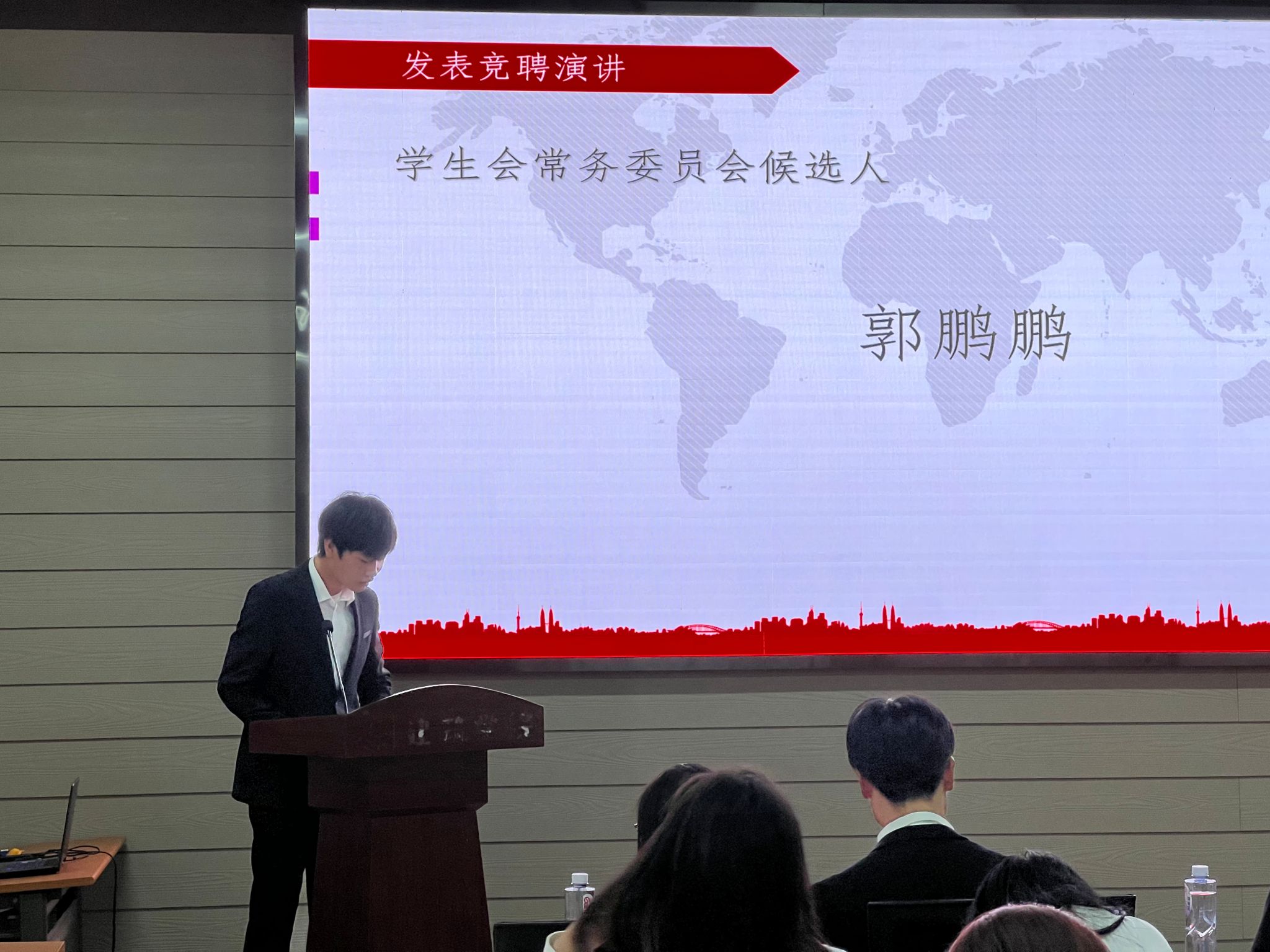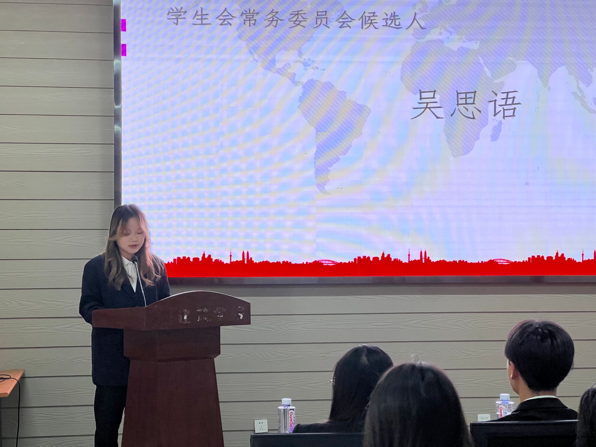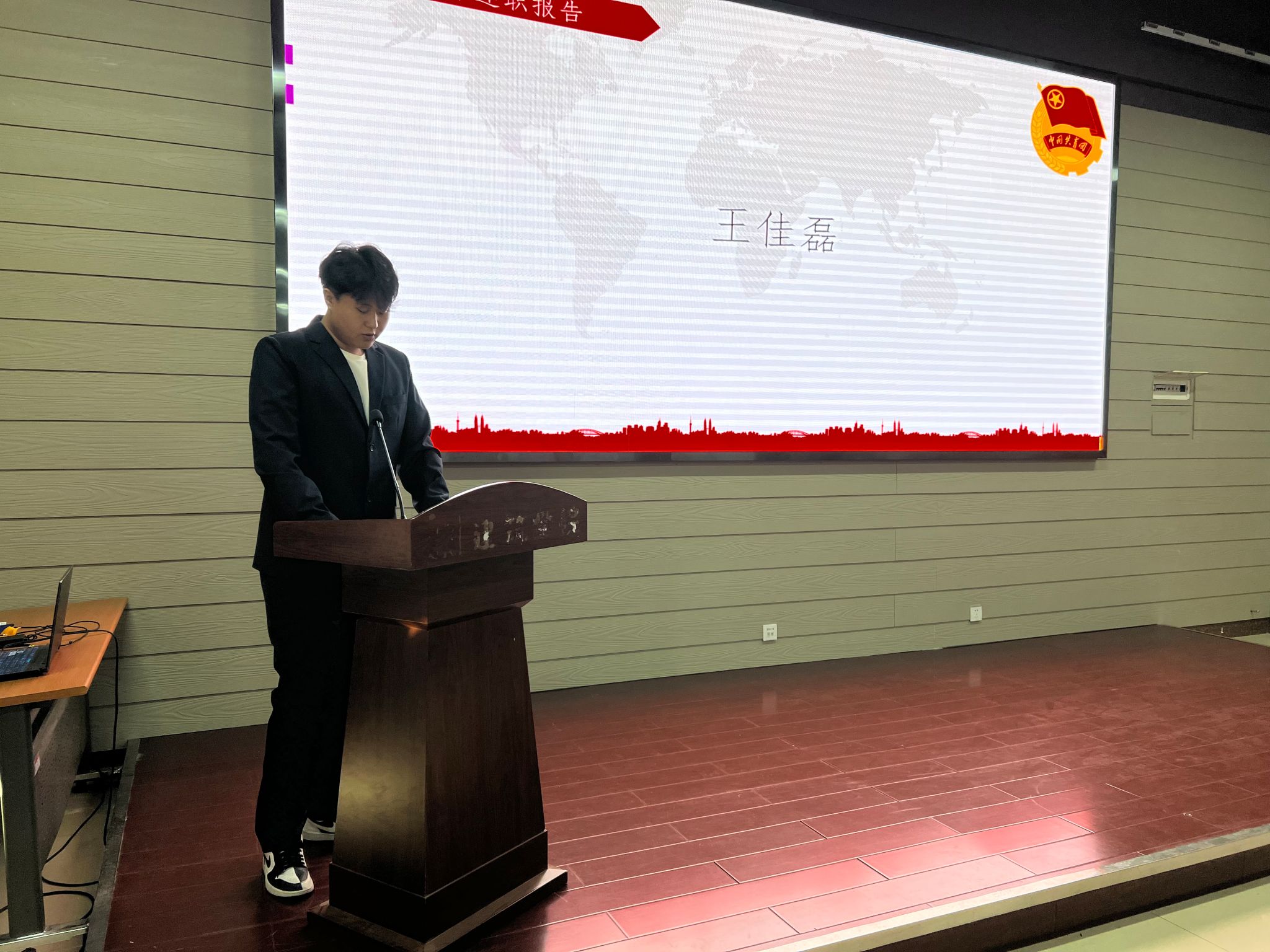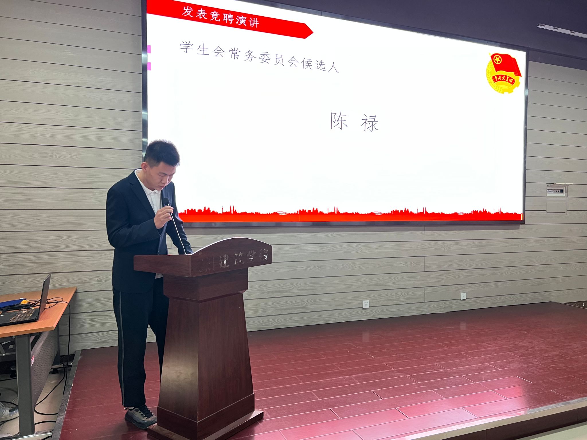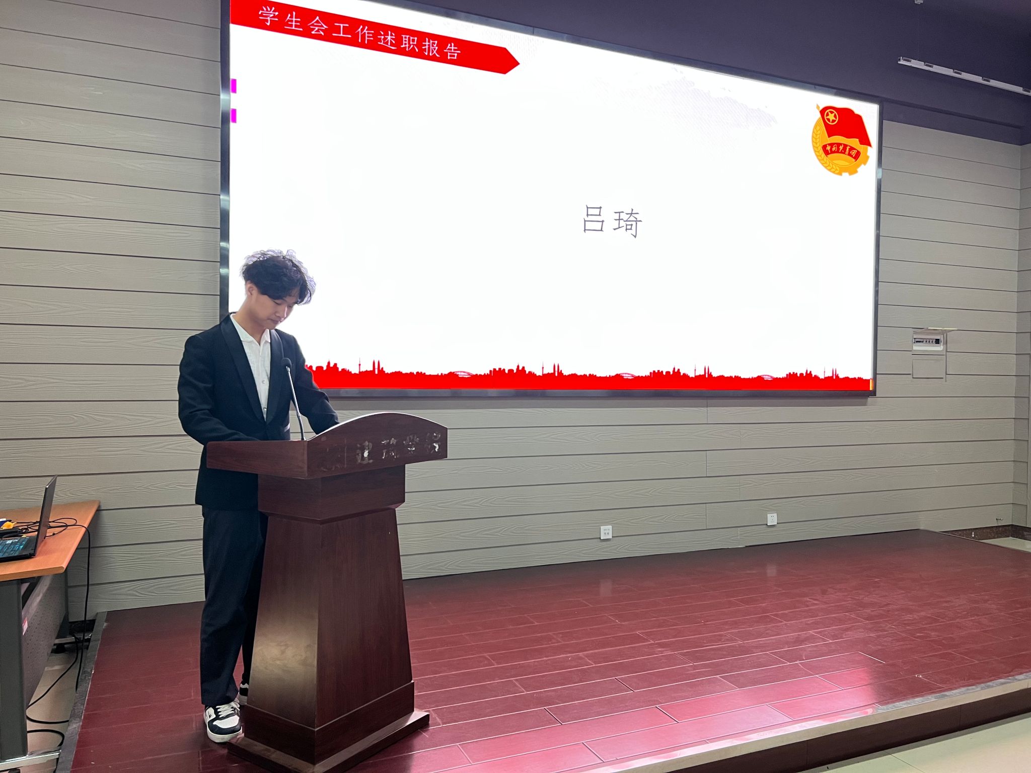 大会在庄严的国歌声中拉开序幕。会议第一项由上一届学生常务委员会代表王佳磊、吕琦同学作2022-2023年度学生会工作述职报告,对过去一年各部门的工作进行总结。随后新一届学生常务委员会候选人依次发言,他们分别从自我介绍、竞选优势和未来展望进行演讲,充分阐述了自己竞选的实力与信心。